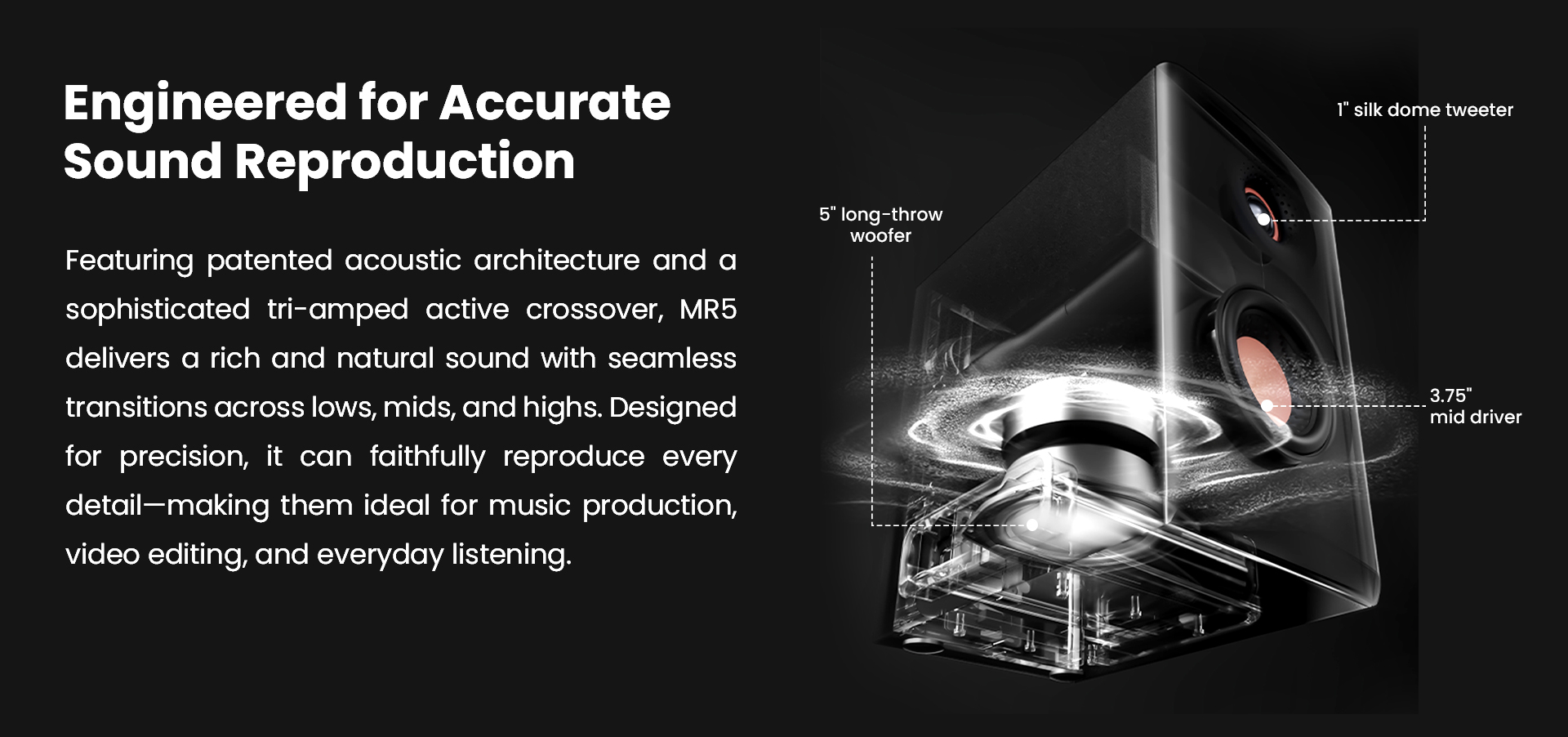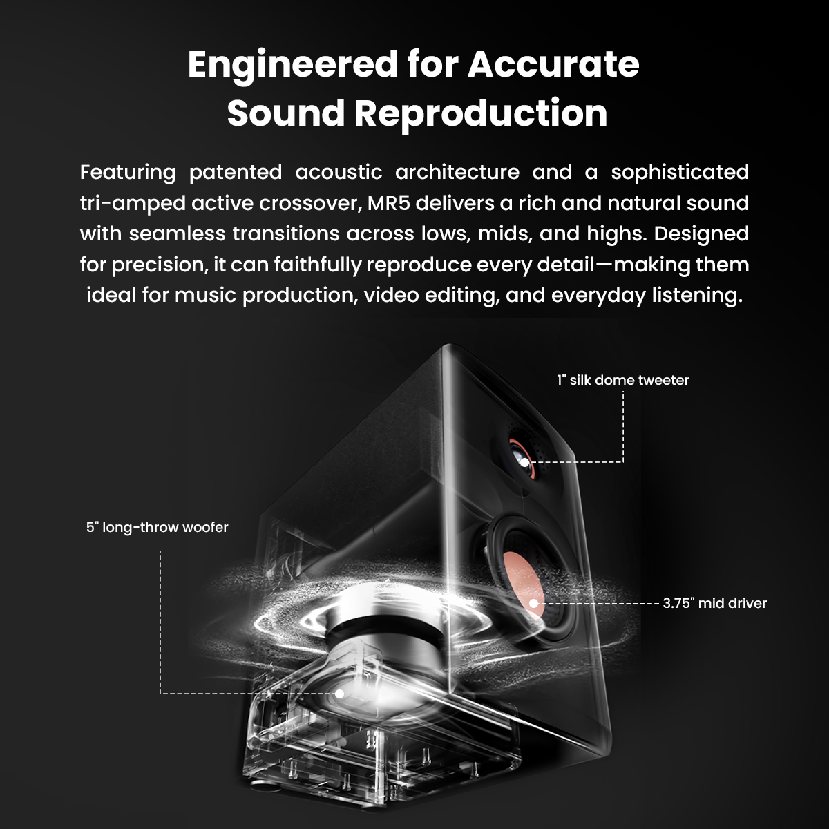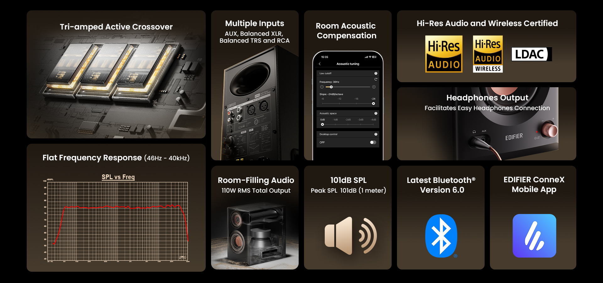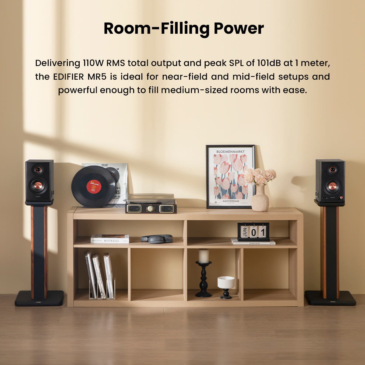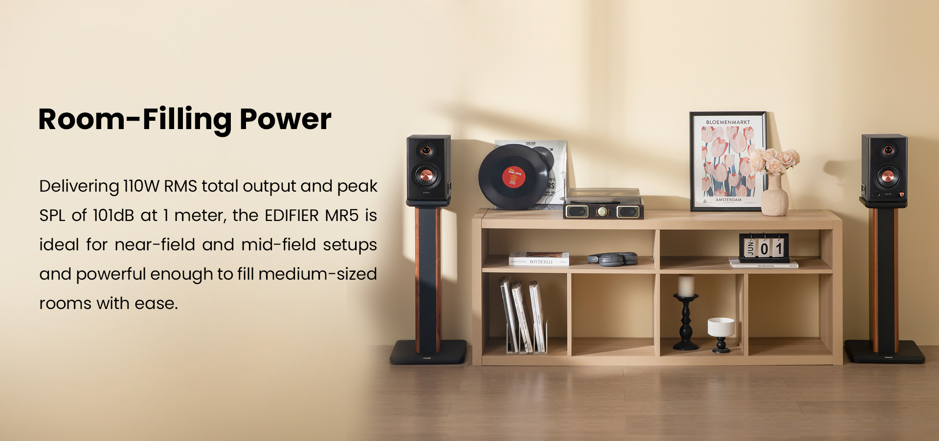 Delivering 110W RMS total output power and SPL up to 101dB (at 1m), suitable for near-field listening and also powerful enough to fill a normal living room