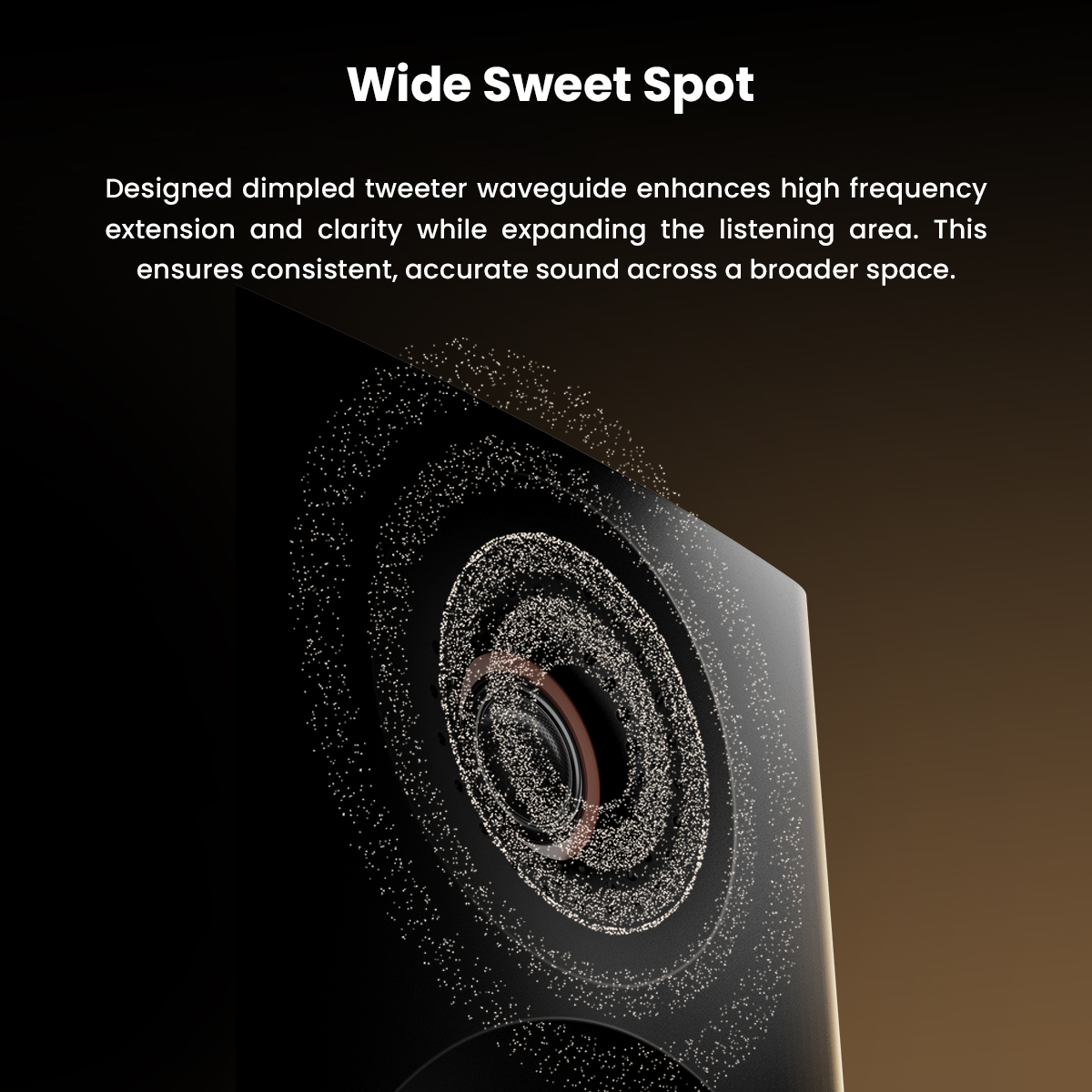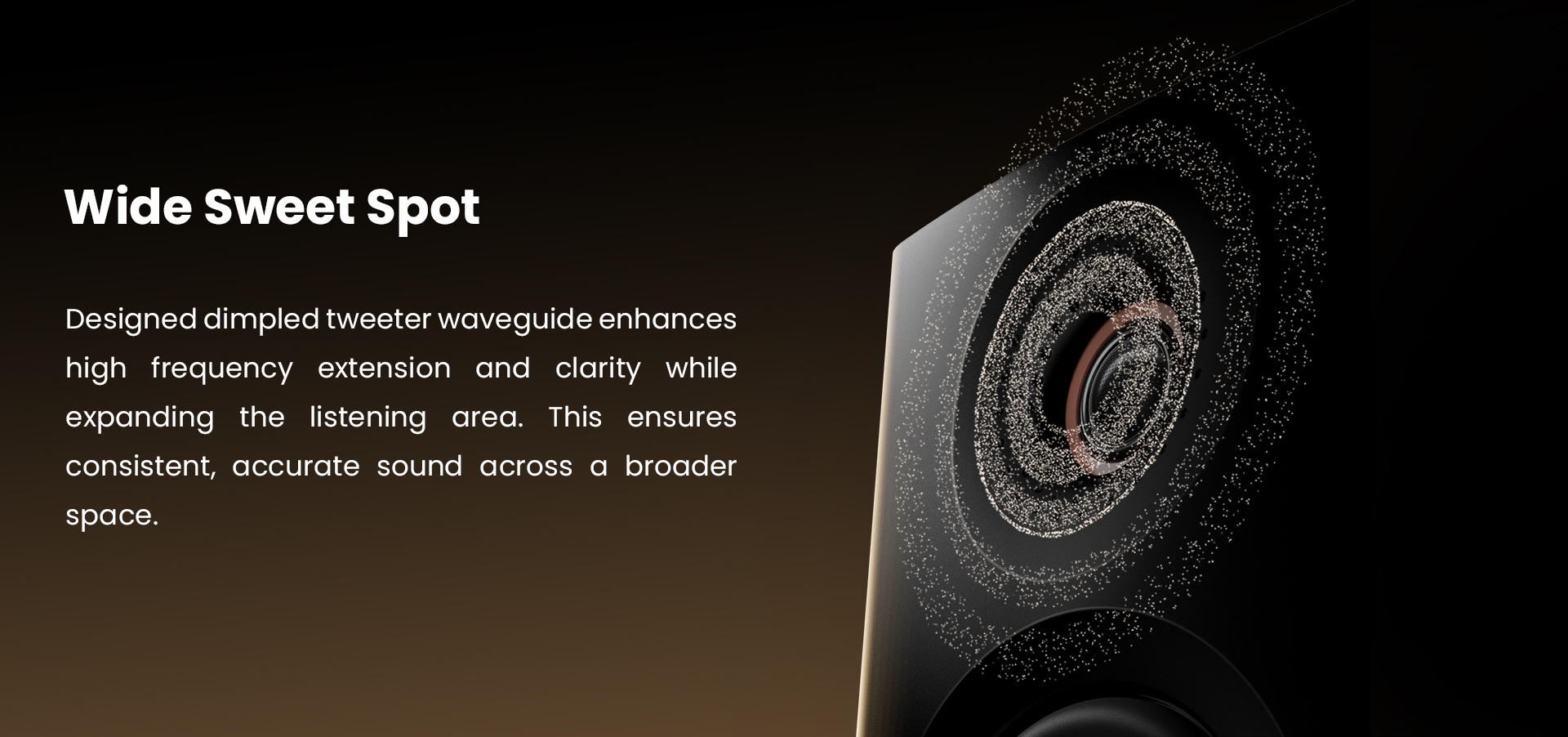 The dimpled tweeter waveguide enhances high-frequency extension and clarity while expanding the listening area