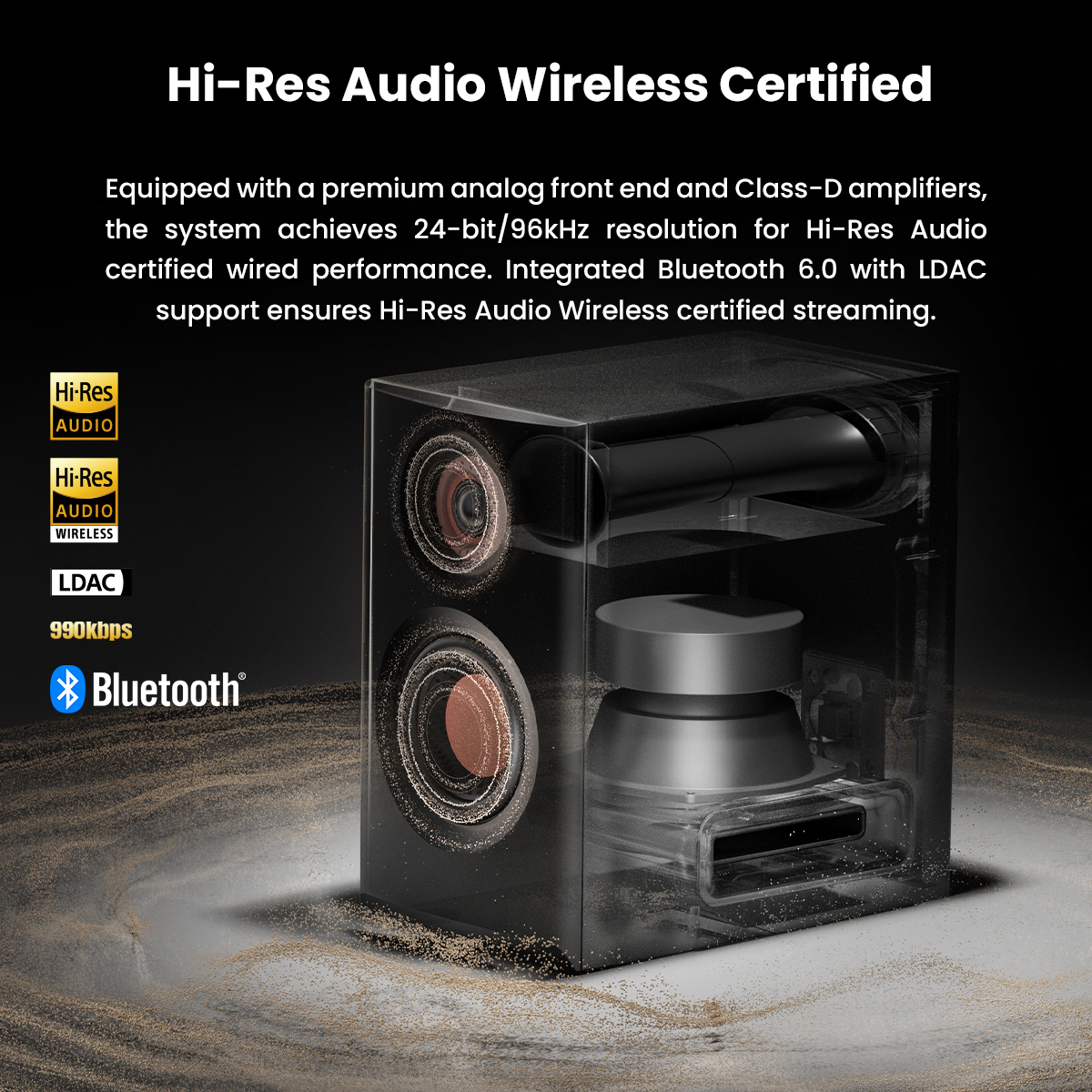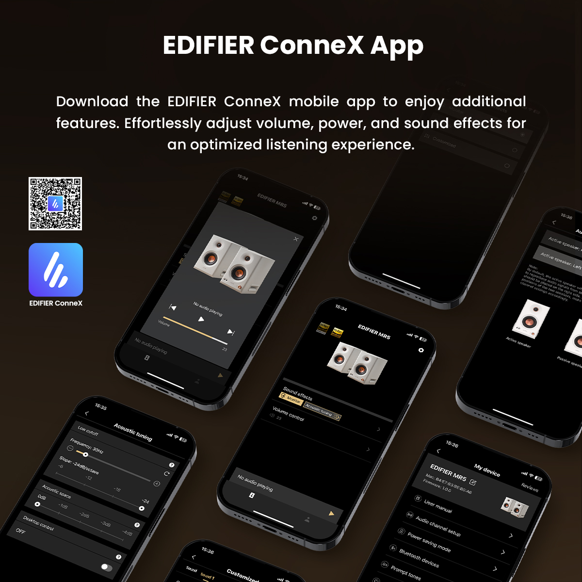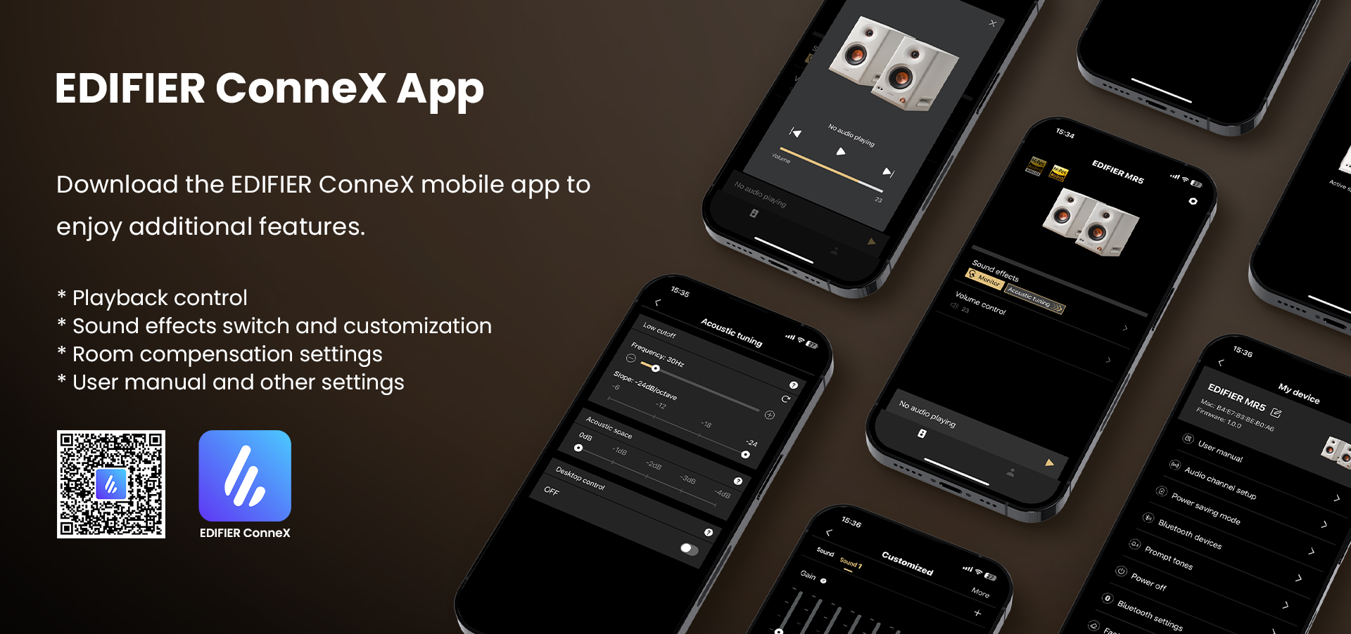 Works with EDIFIER ConneX Mobile app for sound effect switch, EQ customization, room acoustic compensation settings, user manual and etc