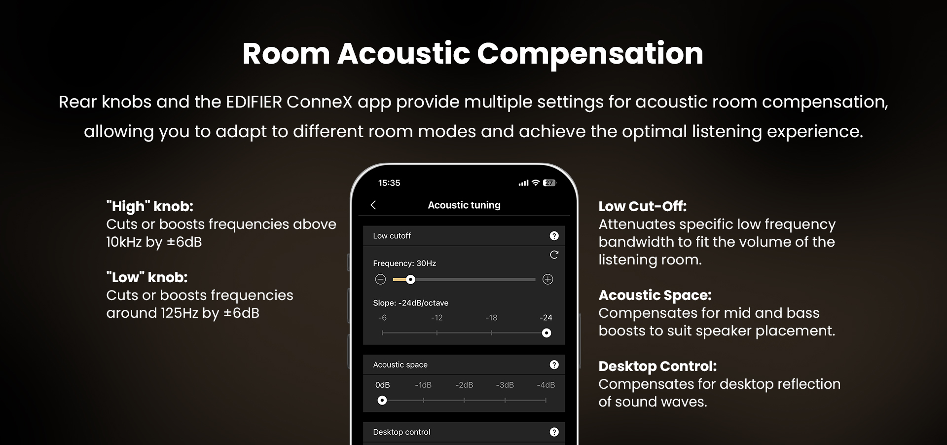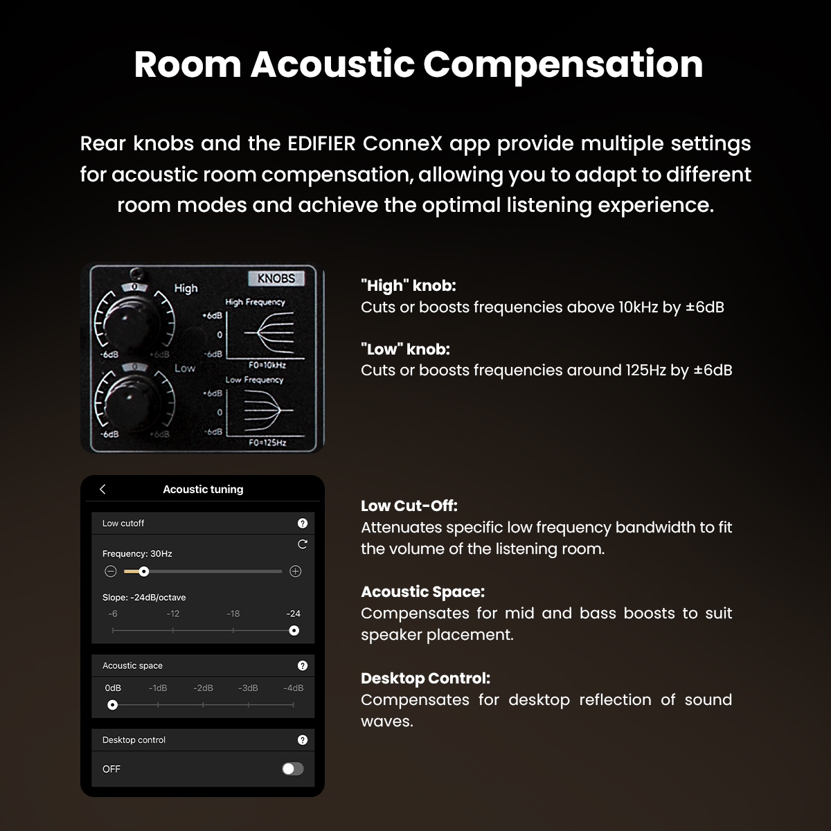 Rear knobs and the mobile app providing multiple settings for room acoustic compensation, to suit different room modes and achieve the optimal listening experience