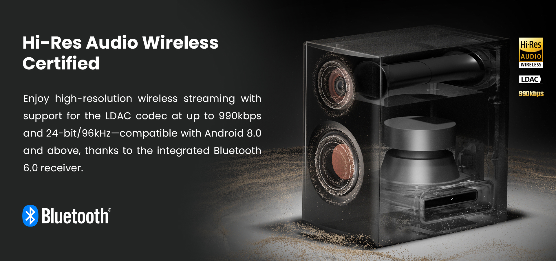 With LDAC supported, granted with Hi-Res Audio Wireless certificate for the reproduction of high-resolution audio signals transmitted through Bluetooth