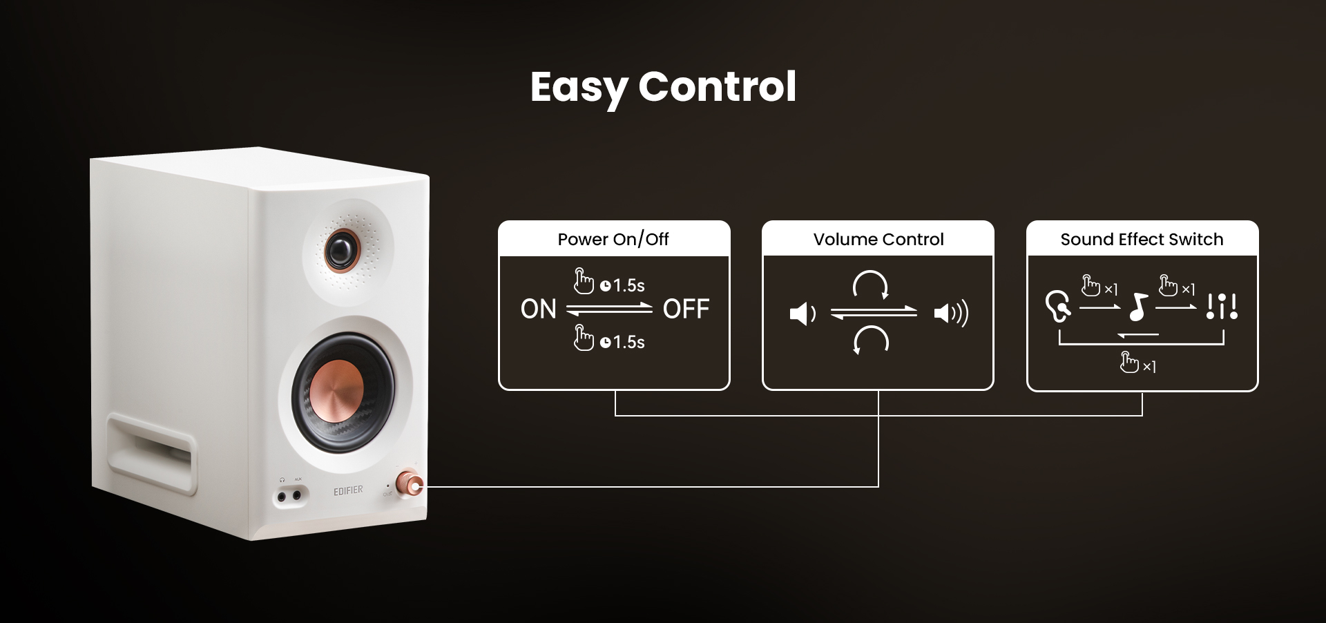 Multi-function knob on the front panel for power-on/off, volume adjustment, and sound effect switch