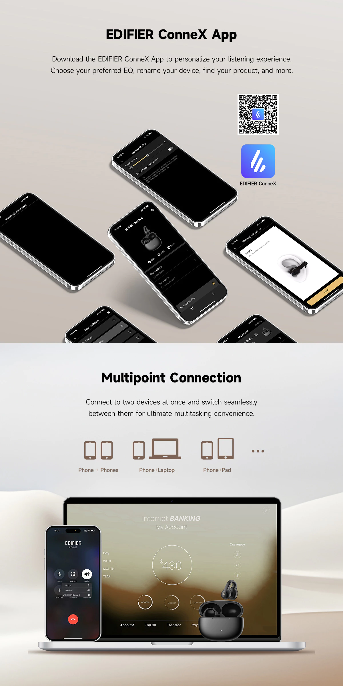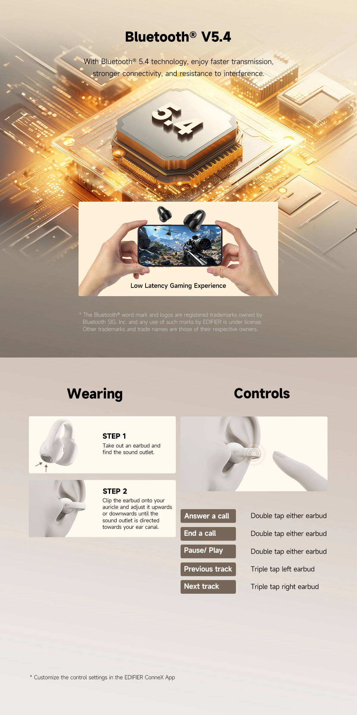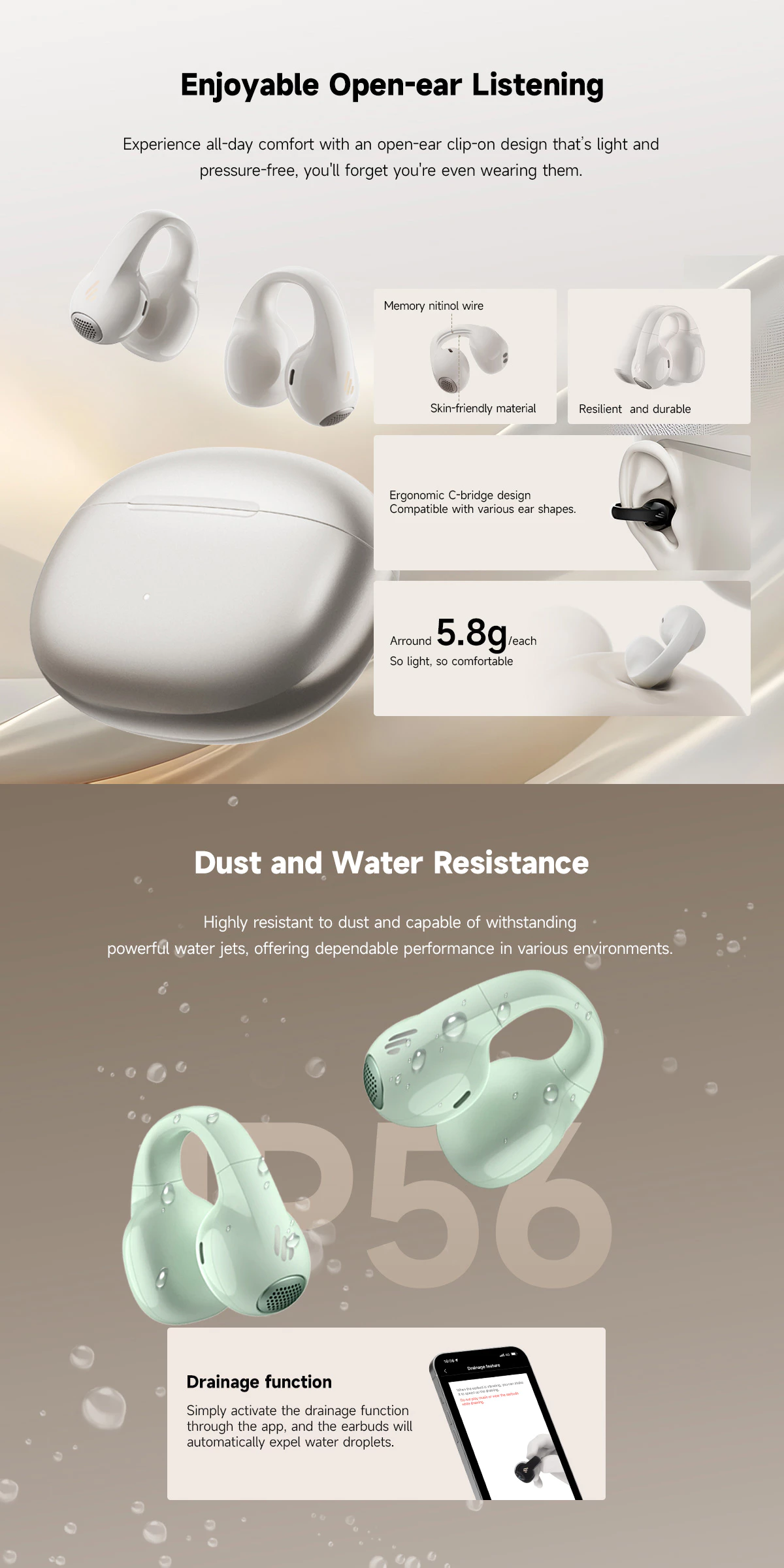• Compatible with the EDIFIER ConneX App for additional functions: drainage function, personalize control settings, find your earbuds, and more.
