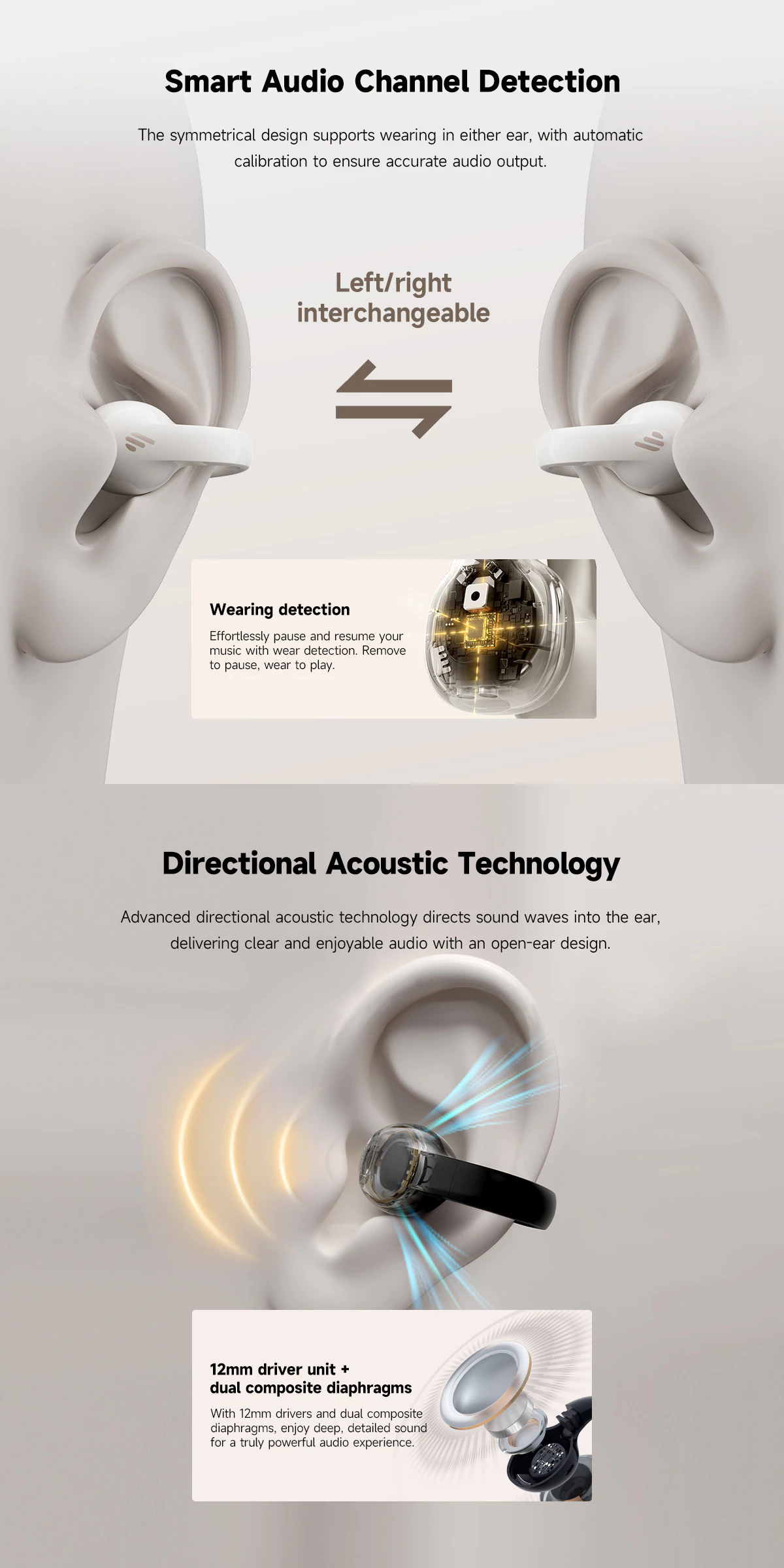 • Effortlessly pause/resume music with wearing detection.