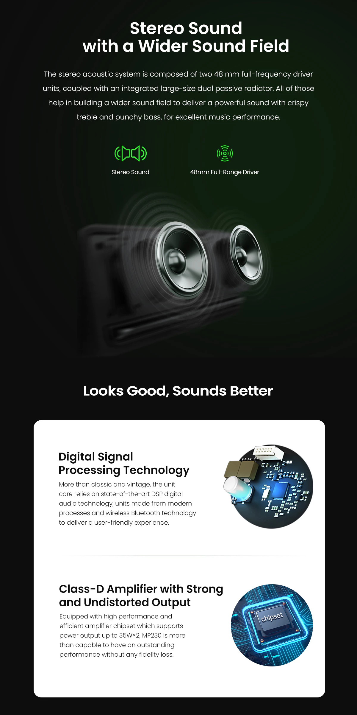 - 48mm full-range driver×2 + large passive radiator×2