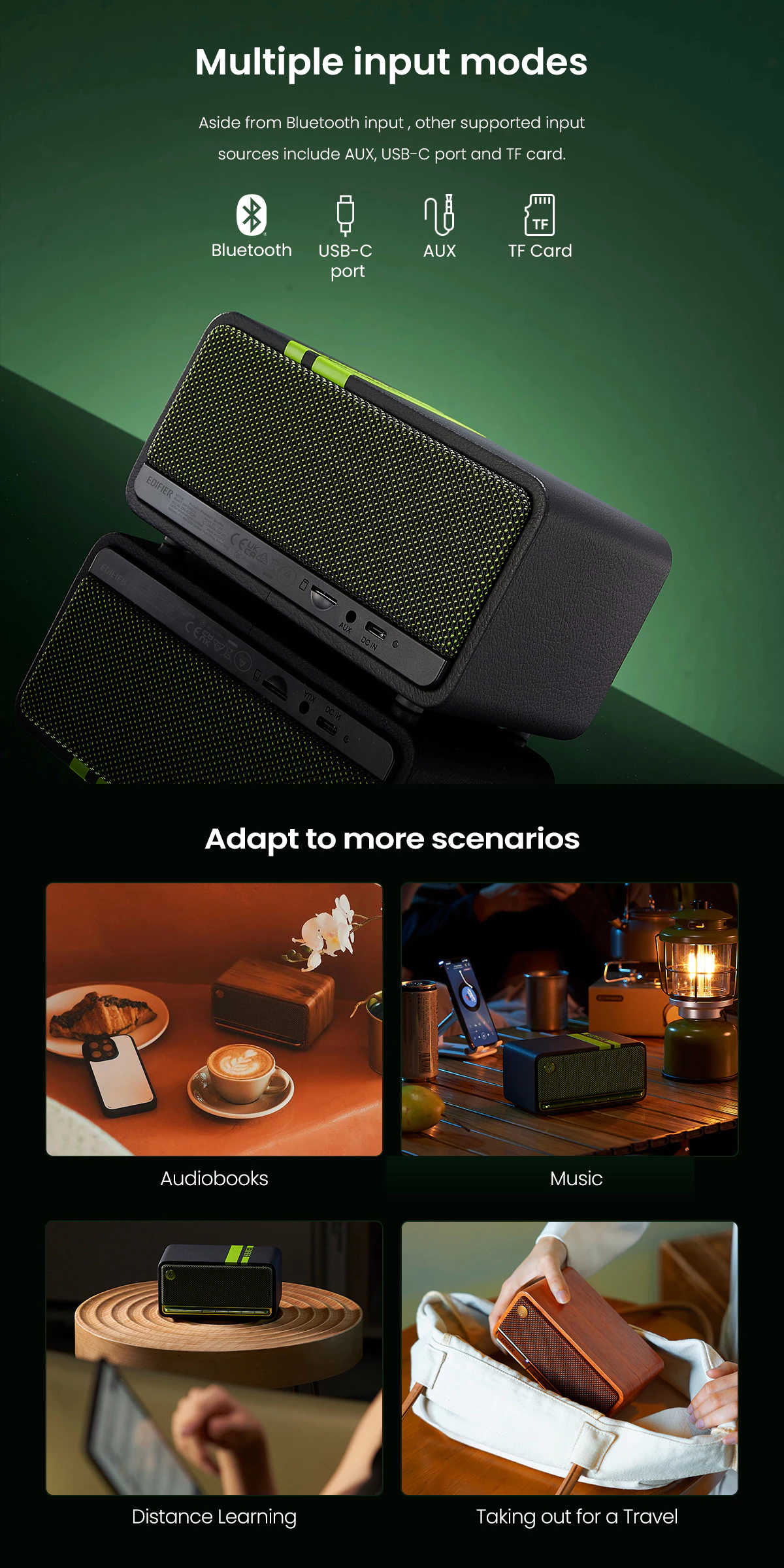 - Support AUX, micro SD card/sound card
