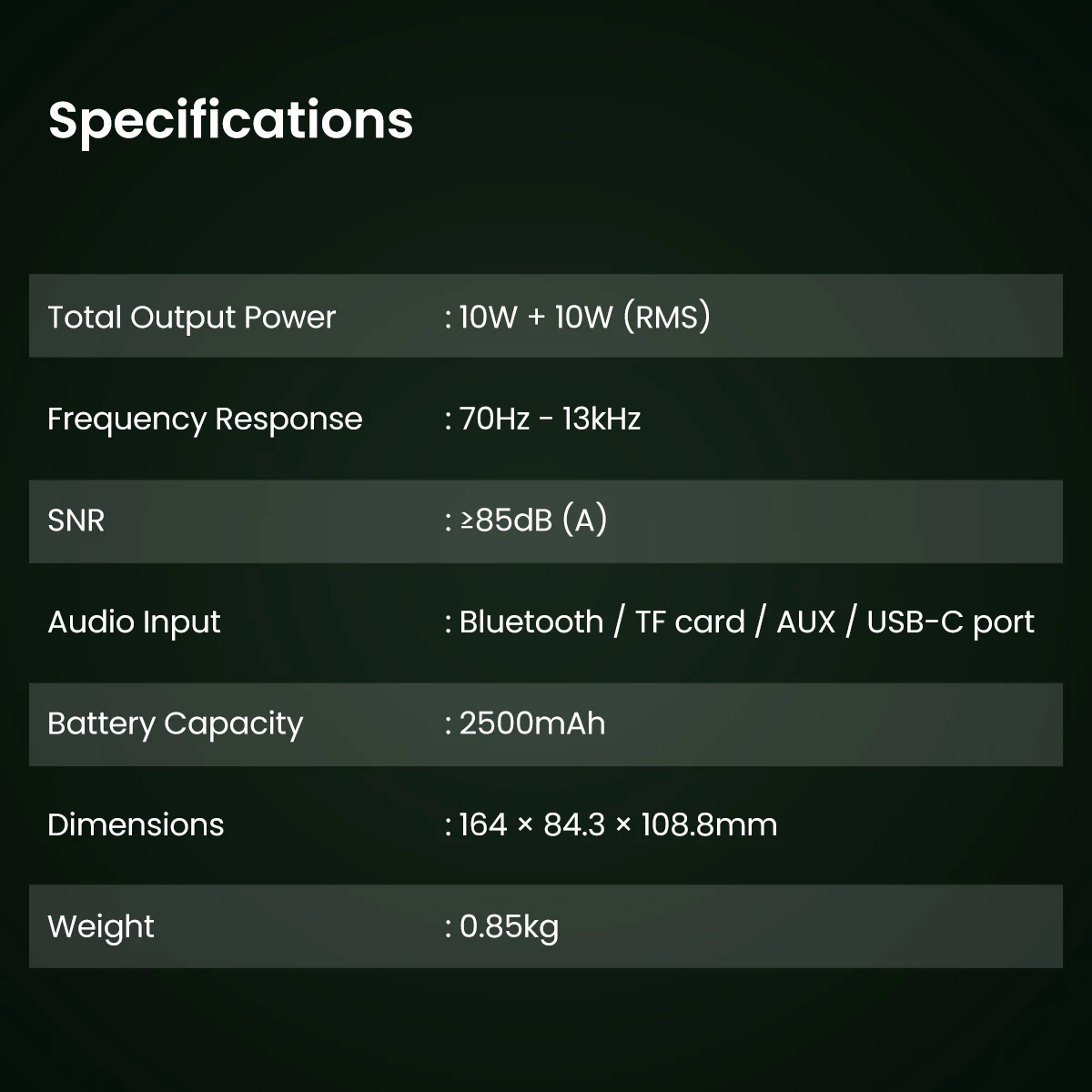 - 10W + 10W power output for pure sound