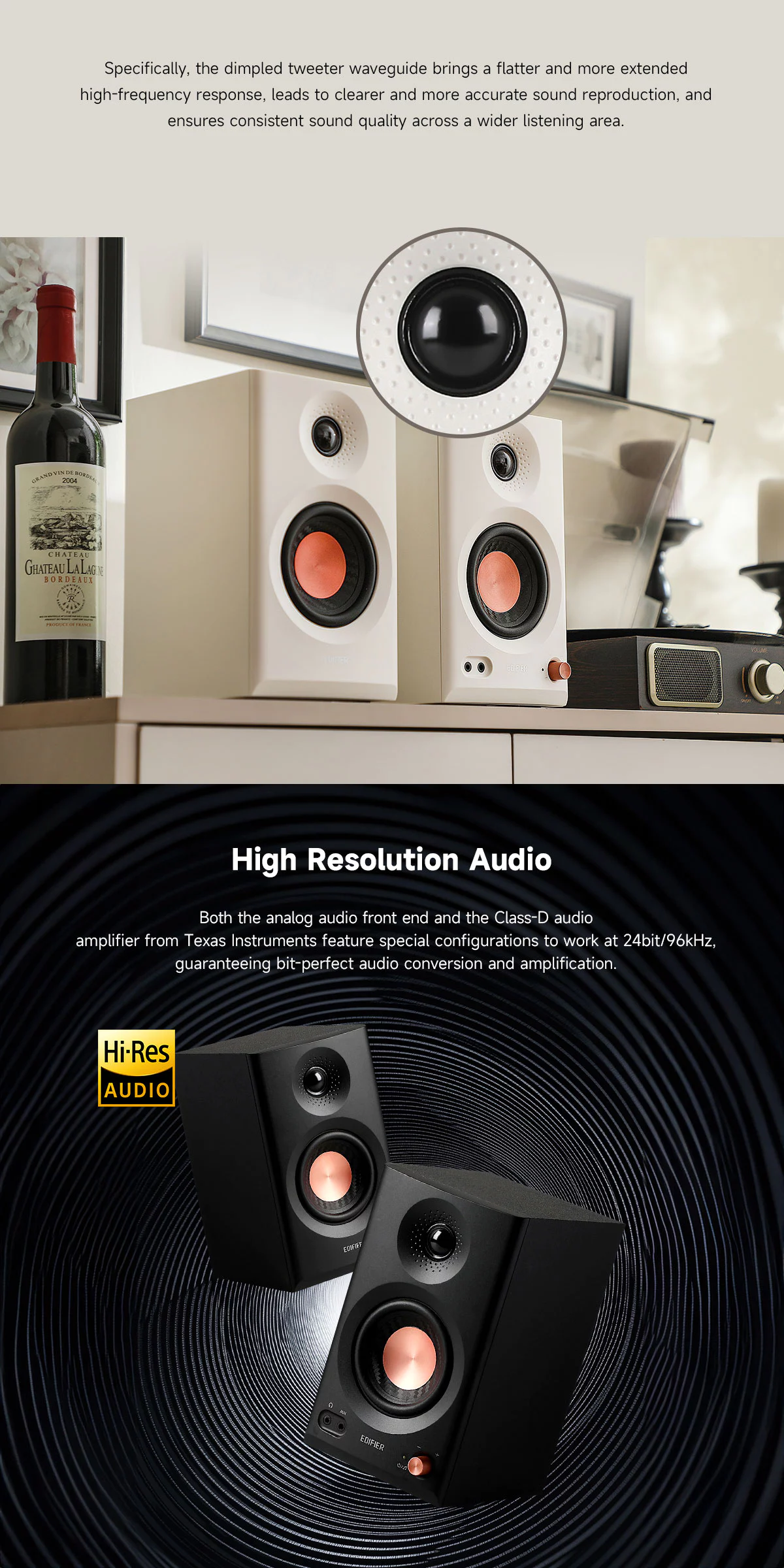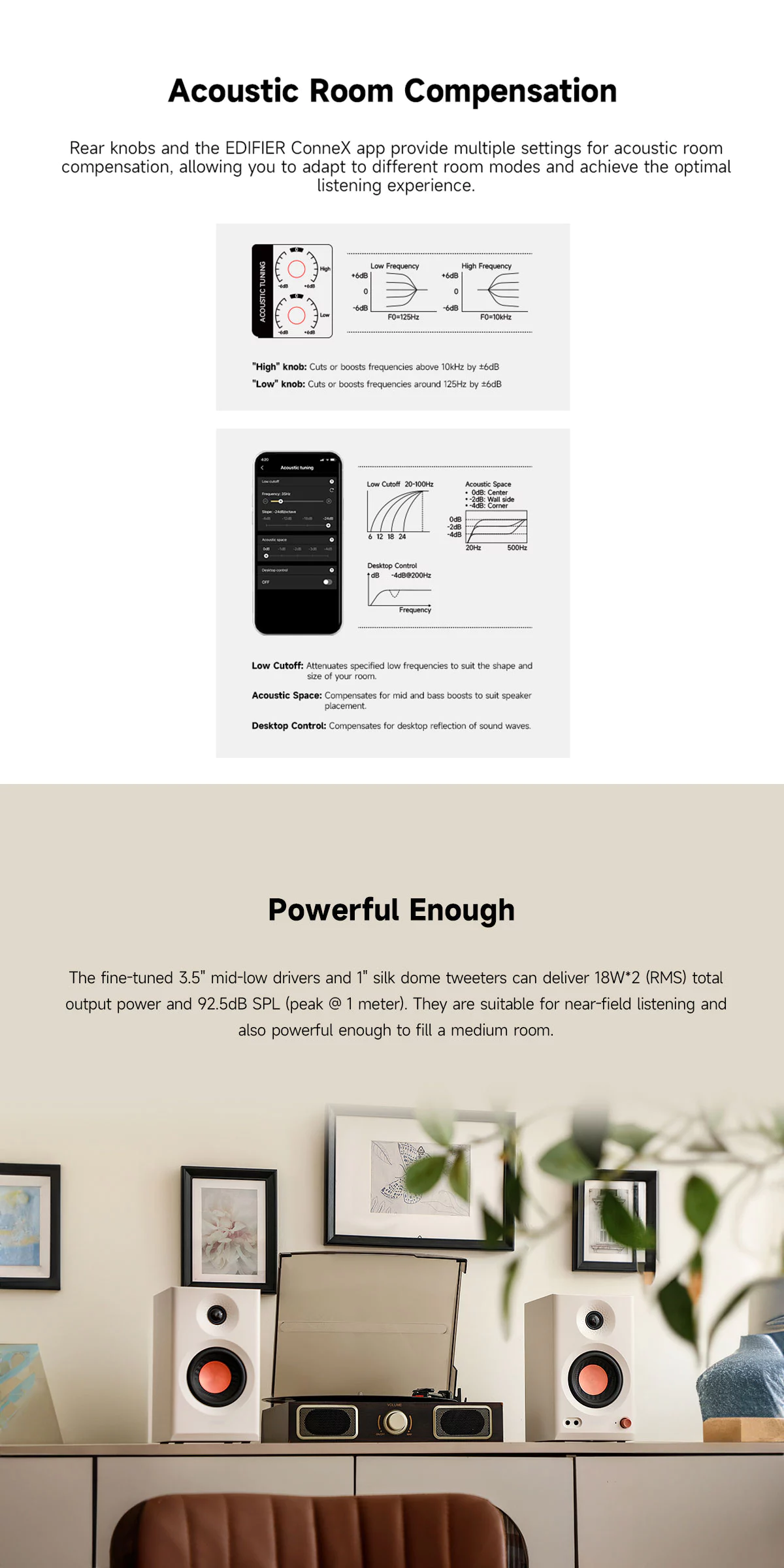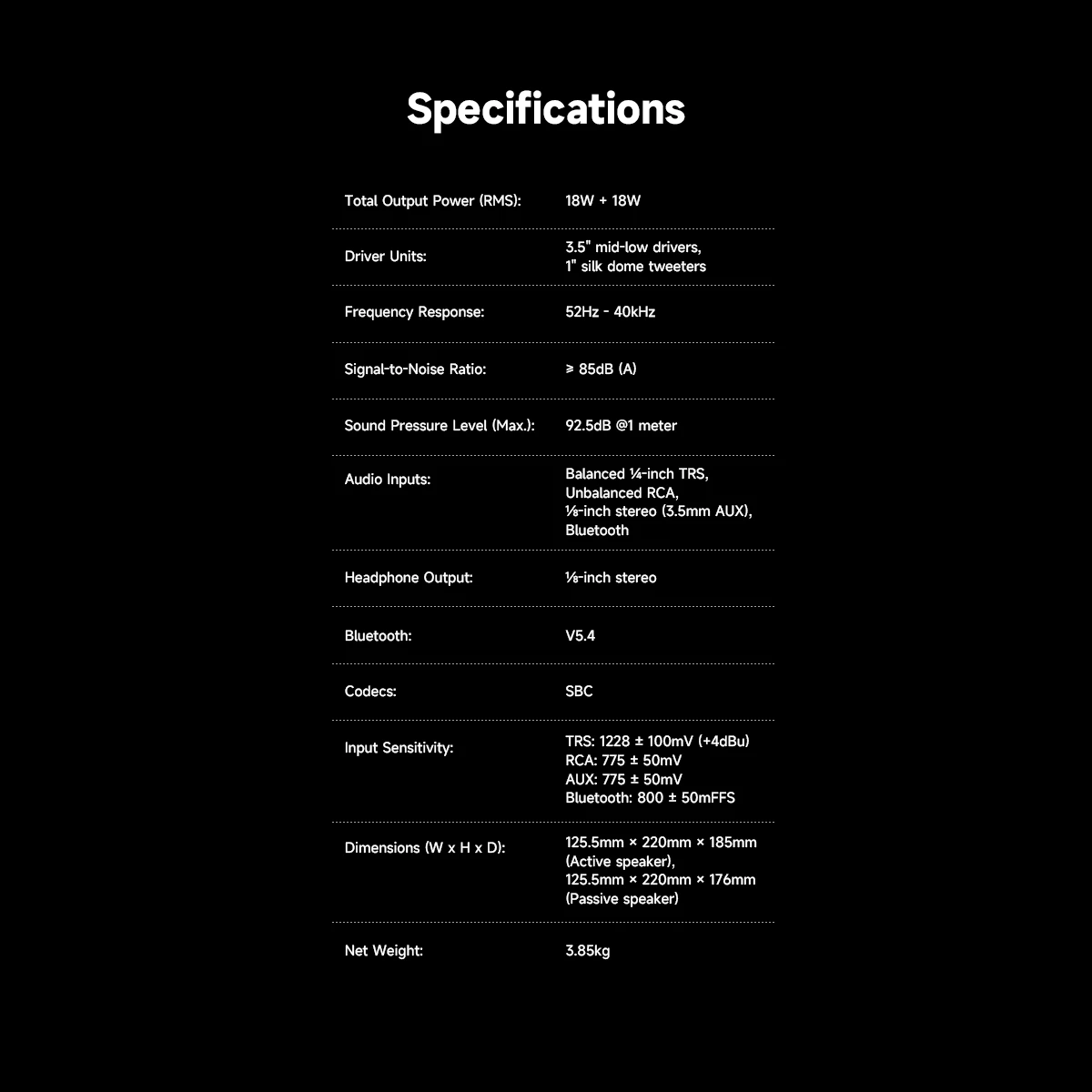 - 18W x 2 (RMS) total output power, with SPL up to 92.5dB (@ 1 meter)