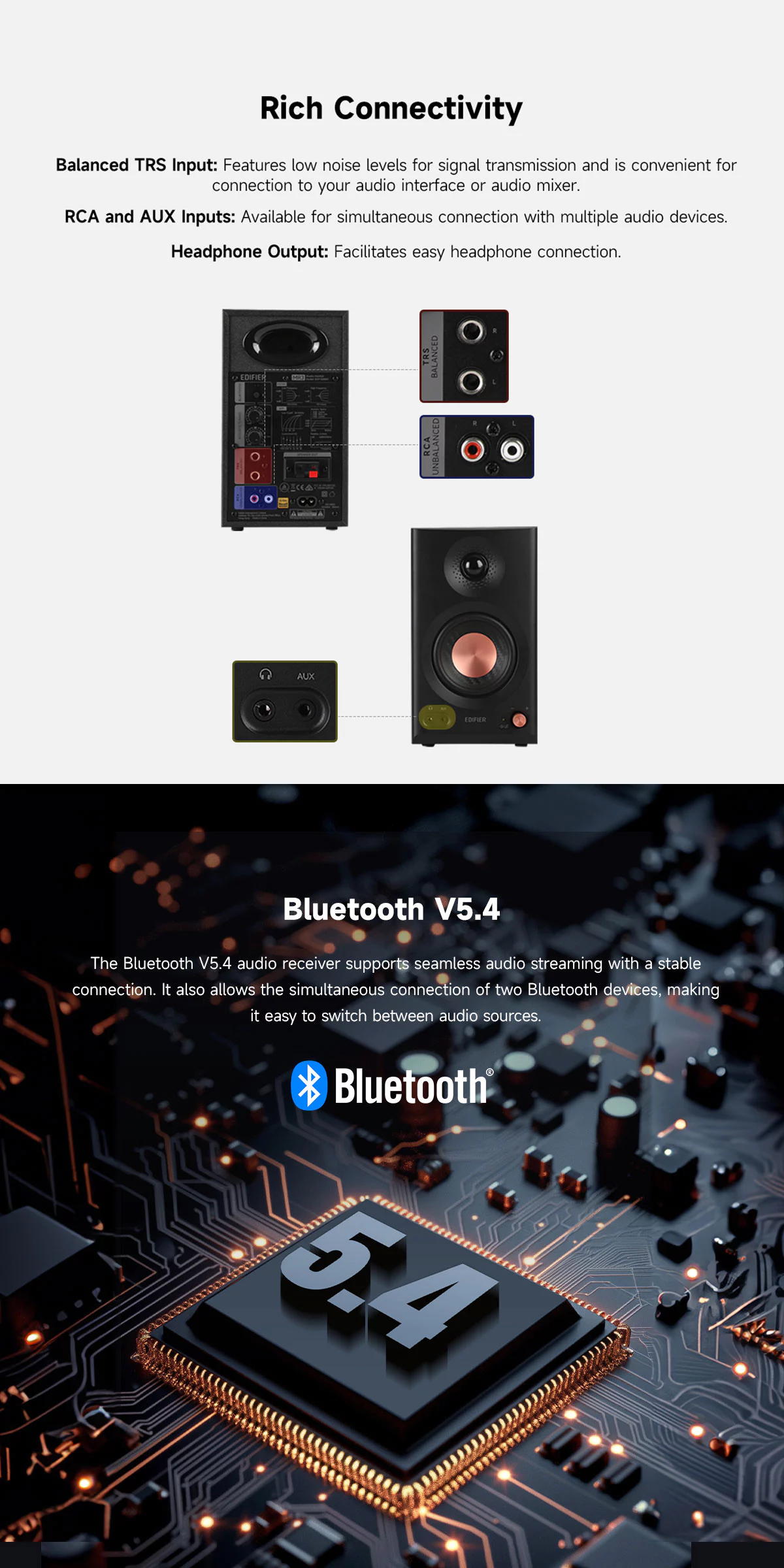- Balanced TRS, RCA, and AUX inputs, with a headphone output socket