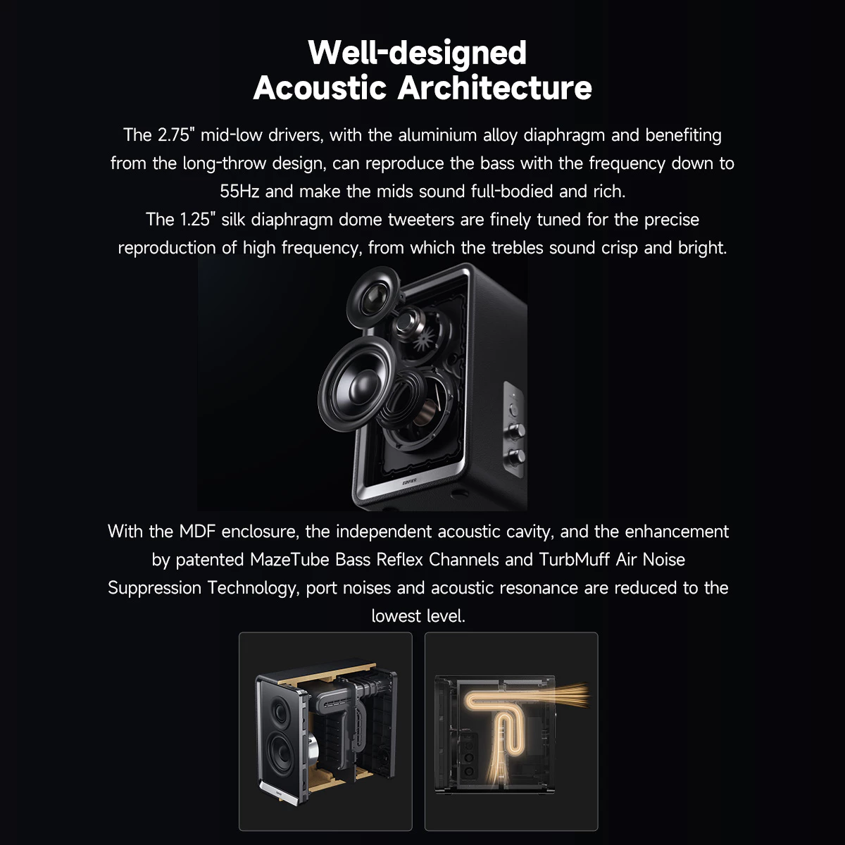 - MazeTube bass reflex channels for strong bass and TurbMuff air noise suppression technology