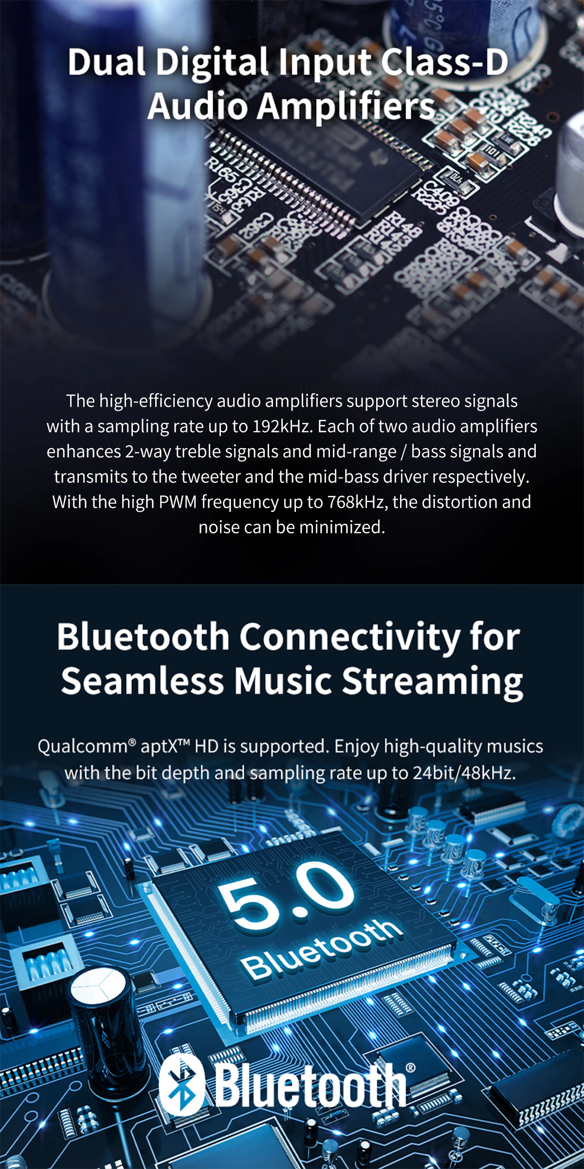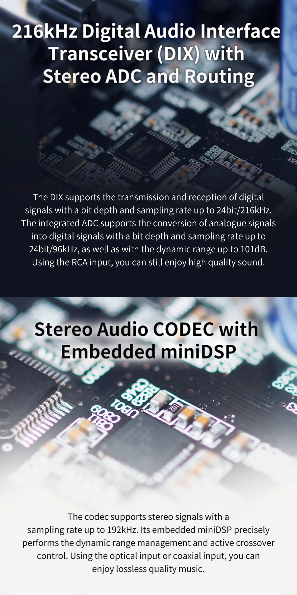• Hi-Res AUDIO certified, supports digital audio signal with a sample rate up to 24-bit/192kHz